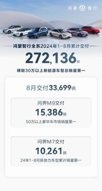 在新能源汽车市场风起云涌的当下,问界新M7系列以其卓越的产品力和持续的创新精神,成为了市场中的一颗璀璨明星。进入金秋九月,各大车企纷纷亮出8月销量成绩单,鸿蒙智行在众多新势力品牌中以272,136辆交付成绩夺得了今年1-8月的累计交付冠军,蝉联30万以上新能源车型总销量第一,再次证明了其在新能源领域的领先地位。