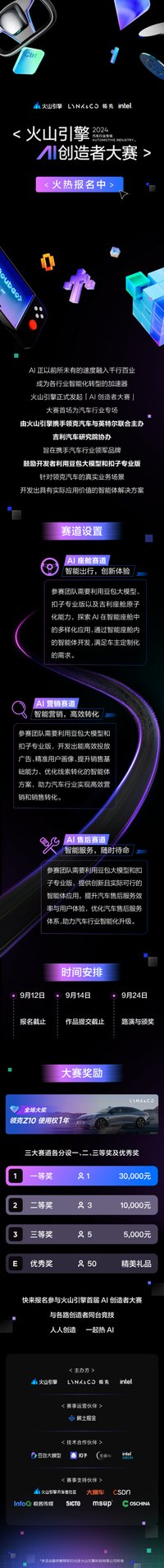 关关 · 2024-08-23 09:19 - 火山引擎携手领克汽车与英特尔,发起首届AI创造者大赛