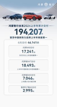 - 鸿蒙智行累计交付194207辆,登顶上半年销量第一7月1日,鸿蒙智行公布了最新交付数据。2024年6月,鸿蒙智行继续保持强劲增长势头,全系交付新车46141辆,创造历史最高月销量纪录,持续引领中国汽车行业发力高端豪华市场。2024年累计交付194207辆,登顶中国新势力品牌上半年销量第一 鸿途 · 2024-07-02 10:42